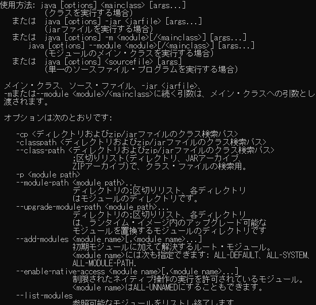 コマンドプロンプトにて 「java」を入力して、エンターキー実行